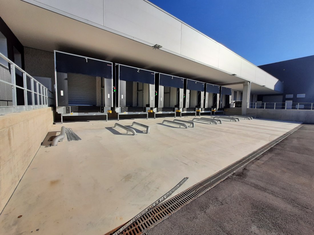 La zona carico/scarico è stata studiata con pedane di carico Hormann applicate all'esterno dell'edificio per recuperare molto spazio di stoccaggio all'interno. Le pedane sono fornite con un adeguato soppalco e con un boccaporto coibentato.